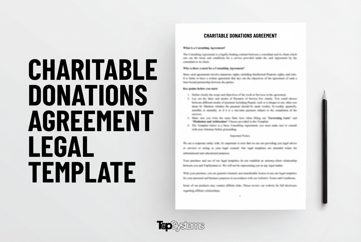 This professional Charitable Donations Agreement template provides a comprehensive legal framework for Charitable Donations arrangements. Designed for businesses and individuals, this template ensures compliance with applicable laws while protecting your interests.
