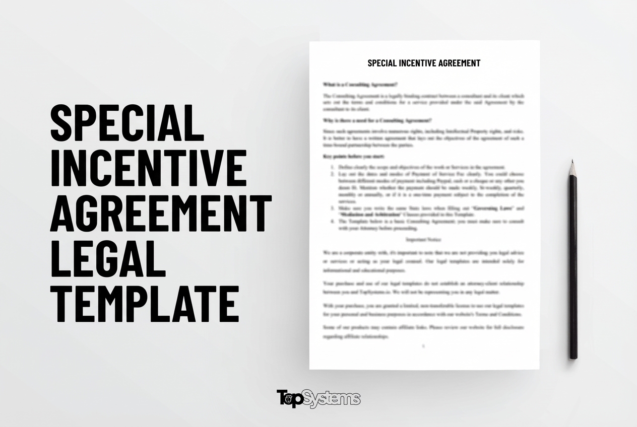This professional Special Incentive Agreement template provides a comprehensive legal framework for Special Incentive arrangements. Designed for businesses and individuals, this template ensures compliance with applicable laws while protecting your interests.